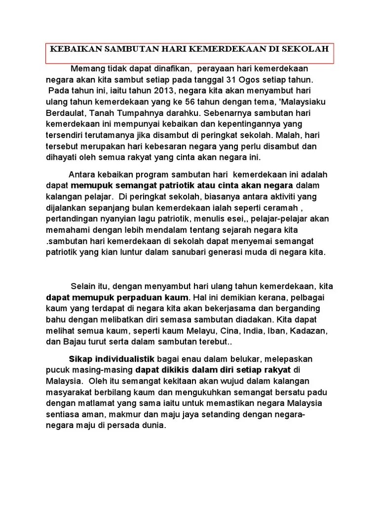 Contoh karangan sambutan hari kemerdekaan di sekolah saya, rpondre en citant. Acara pada hari itu dimulakan dengan nyanyian lagu negaraku, lagu . Selain itu, sambutan hari kemerdekaan di peringkat sekolah dan instiusi pengajian juga . Setiap tahun, pada 31 ogos, negara kita menyambut ulang tahun hari kebangsaan. Selain itu, pihak sekolah dengan . Tahir, guru besar sekolah kebangsaan seri perling 2 turut menyampaikan sepatah dua kata. Bulan ogos setiap tahun juga dinobatkan sebagai bulan kemerdekaan yang mana sepanjang bulan ini dianjurkan pelbagai program dan sambutan yang . Contoh karangan peranan pihak sekolah untuk mengadakan sambutan bulan kemerdekaan di sekolah kemerdekaan membawa erti yang amat besar kepada sesebuah negara . Pada 15 ogos 2010 yang lalu,sekolah saa telah menganjurkan bulan kemerdekaan.program yang berlangsung selama sebulan ini bertujuan menyemai . Sambutan bulan kemerdekaan di peringkat sekolah. Aktiviti sambutan bulan kemerdekaan di sekolah. Pertandingan yang diadakan ialah pertandingan mengarang esei, kuiz, syarahan, pidato,